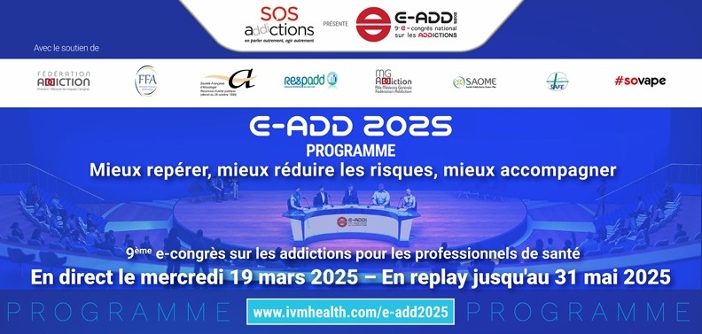 mardi 11 mars 9ème e-congrès sur les addictions réservé aux professionnels de santé 9ème E-Congrès sur les Addictions (E-ADD 2025) : Un rendez-vous incontournable pour les professionnels de santé Le 9ème e-Congrès sur les addictions, dédié aux professionnels de santé, se tiendra cette année dans un format totalement numérique, offrant ainsi une accessibilité optimale à tous les participants, quel que soit leur lieu de pratique. Prévu le 19 mars prochain, cet événement promet de rassembler des experts du domaine pour échanger sur les dernières avancées scientifiques, les bonnes pratiques cliniques et les nouvelles approches thérapeutiques. L’édition 2025 se concentrera sur plusieurs thématiques clés, avec comme base d’échanges « Mieux repérer, mieux réduire les risques, mieux accompagner », ainsi que les enjeux de la prise en charge des patients en situation complexe. Tout au long de la journée de nombreuses conférences, ateliers interactifs et tables rondes permettront aux participants d’approfondir leur compréhension des mécanismes des addictions et d’améliorer leurs compétences en matière de traitement. Les intervenants, reconnus pour leur expertise dans le domaine des addictions, partageront leurs recherches les plus récentes et les pratiques de soins les plus efficaces. Ce congrès est une occasion unique pour les médecins, psychologues, infirmiers, thérapeutes et autres professionnels de santé de se former, d’échanger et de se tenir informés des évolutions scientifiques et législatives sur cette thématique cruciale. Les inscriptions sont dès à présent ouvertes sur le site officiel de l’événement. Ne manquez pas ce rendez-vous essentiel pour renforcer vos connaissances et échanger avec vos pairs sur les défis actuels et futurs dans la lutte contre les addictions. Retrouvez le programme de la journée : PROGRAMME-EADD-2025 Pour plus d’informations et vous inscrire, rendez-vous sur www.ivmhealth.com/e-add2025.
