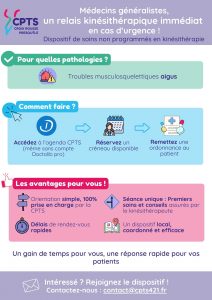 vendredi 27 février Ouverture de créneaux Soins non programmés en kinésithérapie La CPTS Croix-Rousse Presqu’île a mis en place un dispositif de Soins Non Programmés en kinésithérapie à destination des Médecins généralistes à partir du 2 mars 2026. L’objectif ? Offrir à vos patients les premiers soins et conseils lors d’un rendez-vous unique pour des troubles musculosquelettiques aigus. ➕ Les avantages Orientation simple, via un agenda Doctolib CPTS dédié (même si vous n’avez pas de compte Doctolib) Prise en charge rapide, sous 24 à 48h (hors week-ends et jours fériés) Séance unique assurée par un/une kinésithérapeute volontaire du territoire : premiers soins et conseils Aucun frais pour le patient : le dépassement d’honoraires est pris en charge par la CPTS Cet outil vise à répondre à une difficulté fréquente : des patients avec une ordonnance en main, mais sans solution de prise en charge en kinésithérapie rapide. Afin de respecter l’esprit du soin non programmé, ces créneaux sont réservés à des patients présentant des troubles musculosquelettiques aigus, sans suivi kinésithérapeutique en cours ou sans possibilité d’être pris en charge rapidement. Une ordonnance de kinésithérapie reste nécessaire et doit être remise au patient. ✔️ Vous souhaitez orienter vos patients ? Il suffit de nous contacter pour que nous vous ouvrions un accès à l’agenda Doctolib CPTS, depuis lequel vous pourrez réserver un créneau disponible. N’hésitez pas à revenir vers nous pour toute question ou pour obtenir votre accès : contact@cpts421.fr