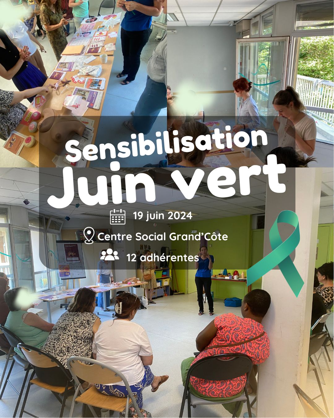 vendredi 20 juin Sensibilisation JUIN VERT 💡 Et si on levait les tabous sur le dépistage et la prévention de la santé féminine ? 📅 Jeudi 19 juin, au Centre Social Grand’Côte (Lyon 1er), la sensibilisation était au rendez-vous pour Juin Vert et les kits d’auto-dépistage ! 💚 12 participantes ont profité des interventions de Sophie DANIS (CRCDC), Eleanor BELINKI (sage-femme au CSES Hospices Civils de Lyon – HCL) et Frédérique AUDY (pharmacien-biologiste à la CPTS). Grâce à un jeu interactif sur les idées reçues, les échanges ont été riches et décomplexés. Les adhérentes ont pu poser toutes leurs questions, s’initier à l’autopalpation sur un buste pédagogique, et repartir, si elles le souhaitaient, avec une ordonnance et un kit d’auto-prélèvement. 🩺📝 🙏 Un immense merci aux intervenantes pour leur engagement, et à Amélie LENNINGER pour son accueil chaleureux et son enthousiasme ! Une matinée pleine d’échanges, d’informations et de prévention, pour la santé de toutes !